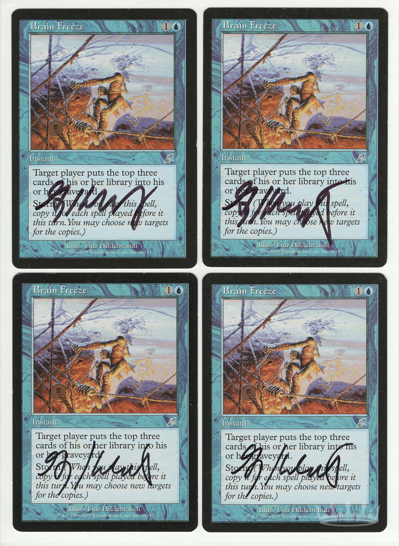 Detailed Notes: these cards have light surface/edge wear. This product is a listing for a full playset (4 copies) of Brain Freeze (Scourge), signed by artist Greg Hildebrandt.