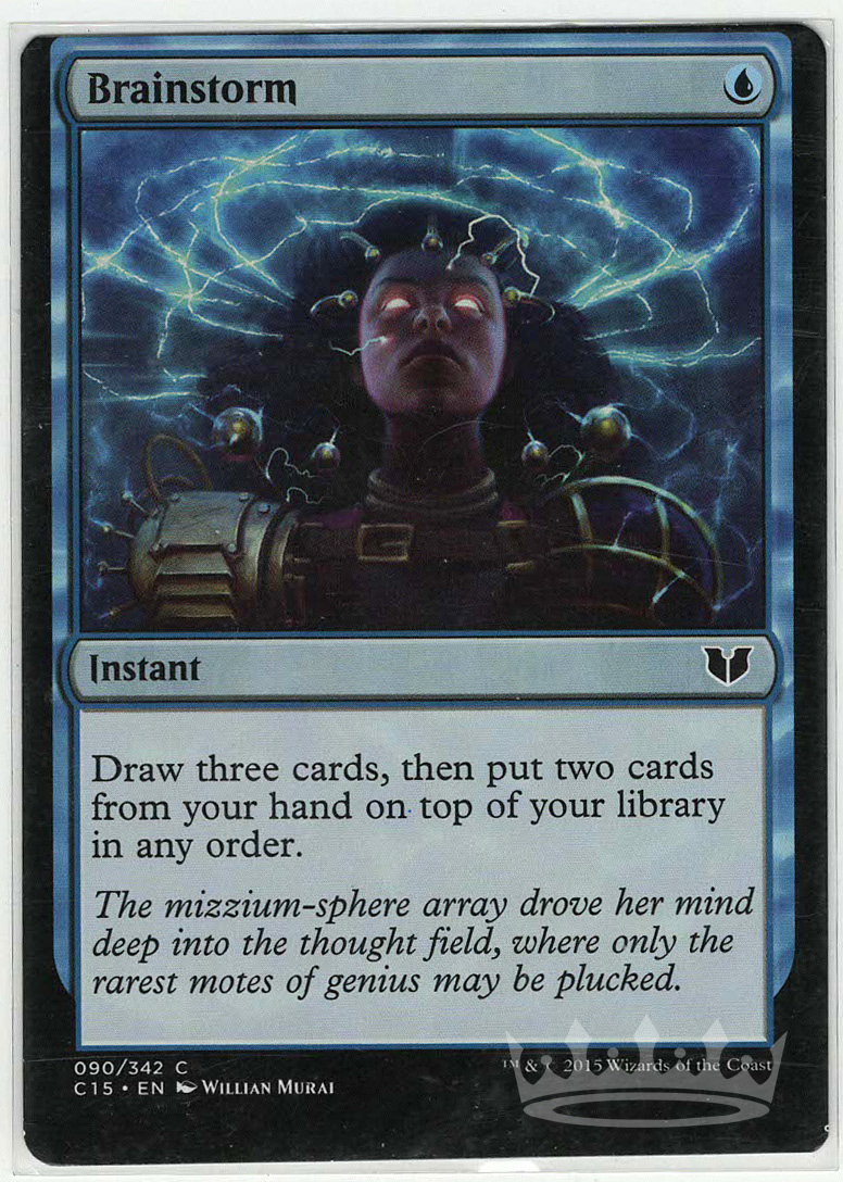 Detailed Notes: this cards has minimal surface/edge wear. This product is a listing for a rare factory miscut misprinted Brainstorm, from Commander 2015.