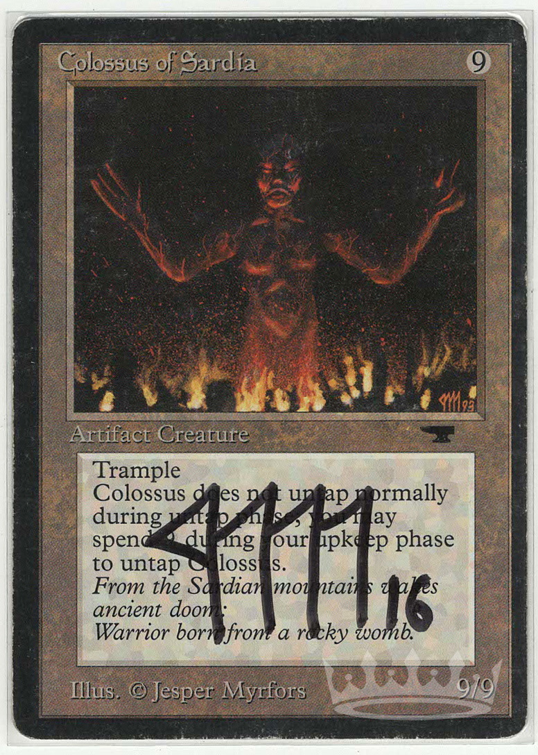 Detailed Notes: this card has moderate to heavy surface/edge wear. This product is a Colossus of Sardia, signed by artist Jesper Myrfors.