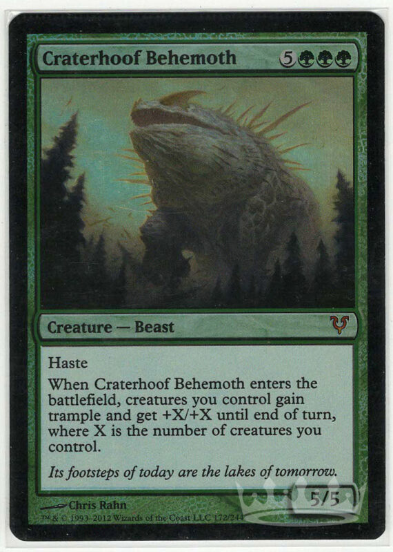 Detailed Notes: this cards has minimal surface/edge wear. This product is a listing for a rare crimped misprinted Craterhoof Behemoth (Foil), from Avacyn Restored.