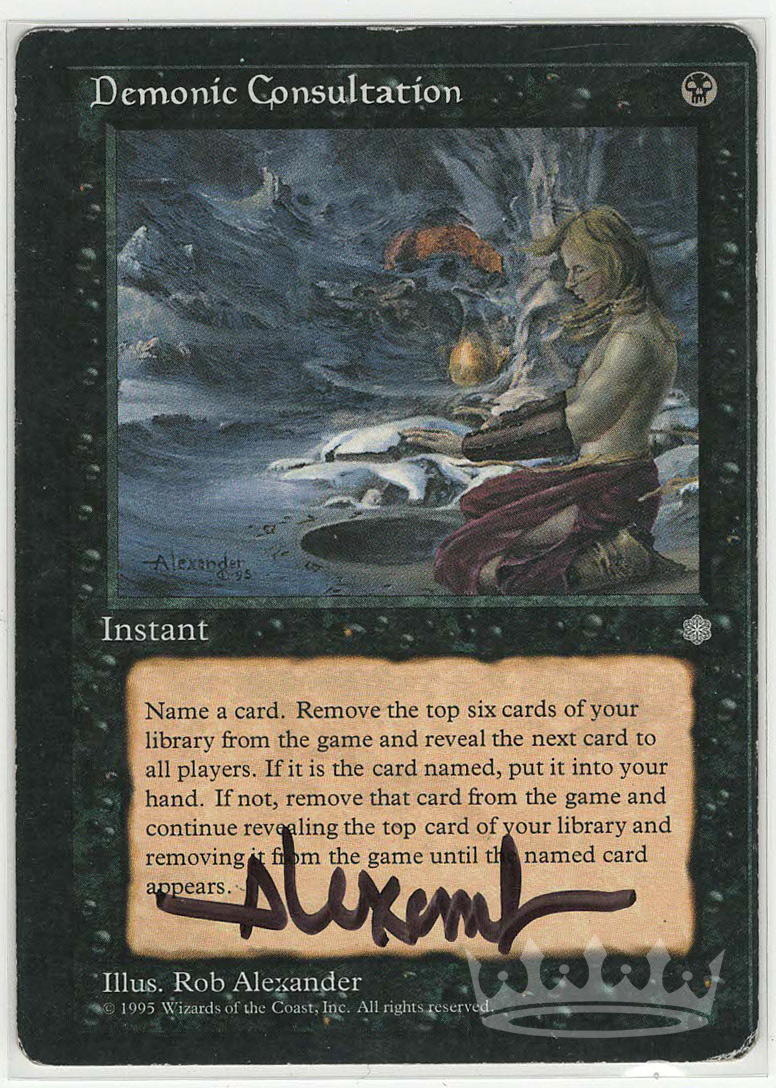 Detailed Notes: this cards has moderate surface/edge wear. This product is a listing for a rare factory miscut misprinted Demonic Consultation, from Ice Age, signed by artist Rob Alexander.