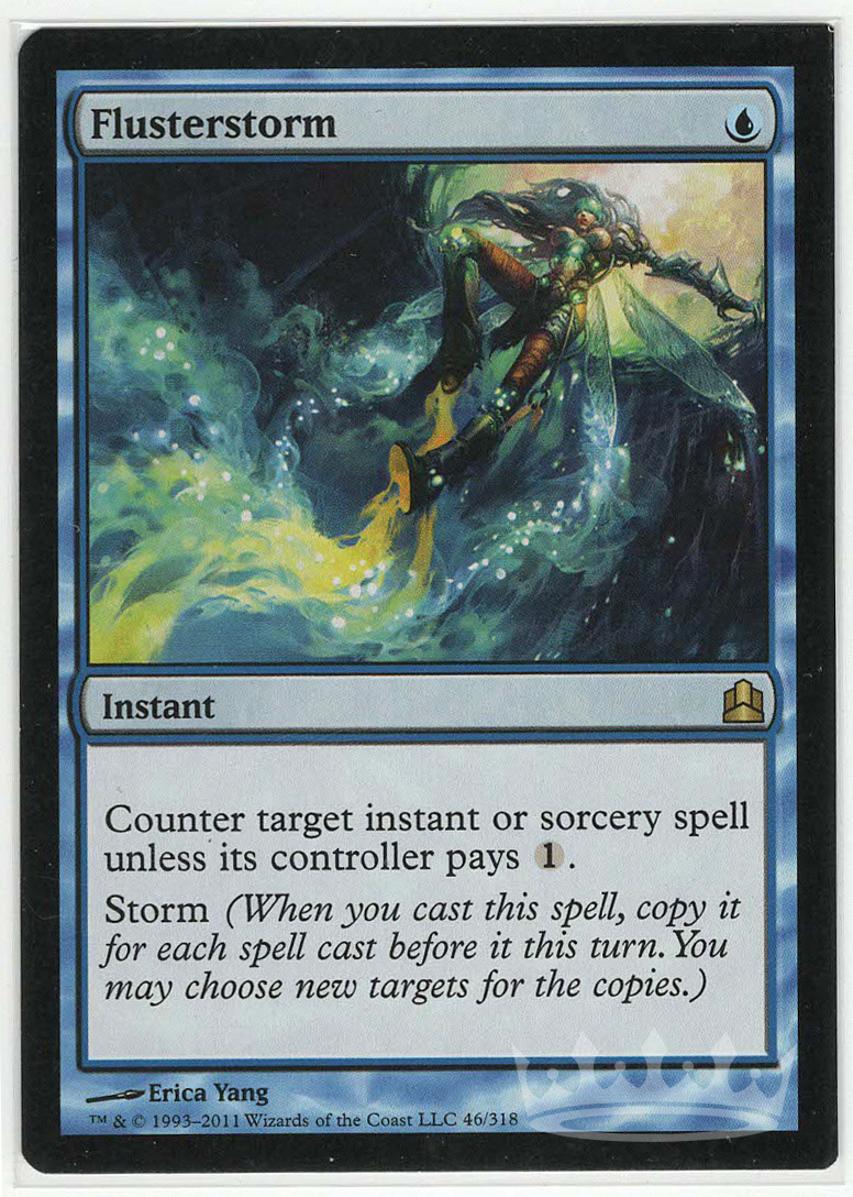 Detailed Notes: this cards has minimal surface/edge wear. This product is a listing for a rare factory miscut misprinted Flusterstorm, from Commander 2011. As shown in the scan, the upper right corner is square, while the other three corners are cut round as normal.