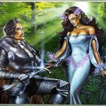 Created for the Magic: The Gathering Alliances expansion, Juniper Order Advocate is a wonderful piece by iconic fantasy artist Douglas Shuler. Released in 1996 by Wizards of the Coast, as part of the Ice Age block, Juniper Order Advocate highlights the artist’s classic use of light and composition. The color palette of rich greens, fuchsia, and soft white is striking in person. This piece is wonderfully framed with quadruple matting to accent the dark greens and natural colors in the illustration.