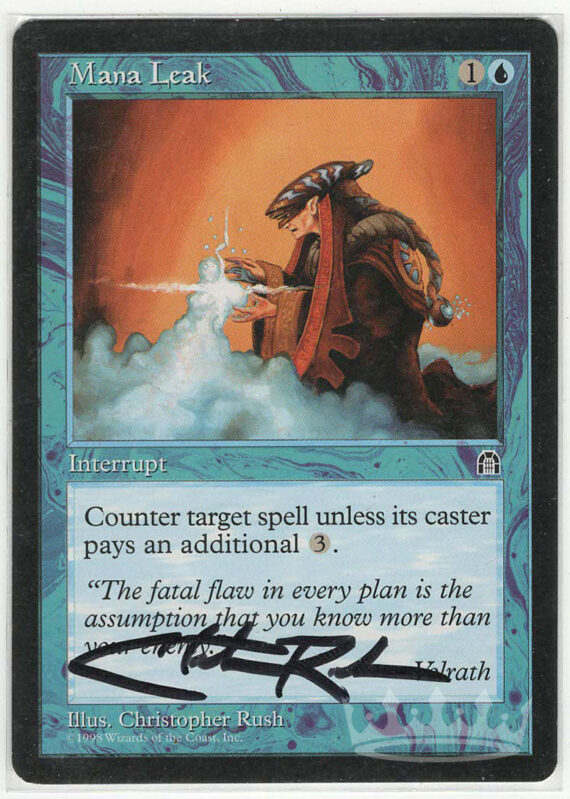 Detailed Notes: these cards have light or minimal surface/edge wear. This product is a listing for a Mana Leak, signed by artist Christopher Rush.