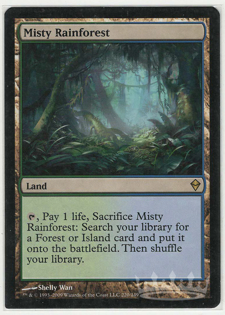 Detailed Notes: this cards has light surface/edge wear. This product is a listing for a rare factory miscut misprinted Misty Rainforest, from Zendikar. As shown in the scan, the lower left corner is square, while the other three corners are cut round as normal.