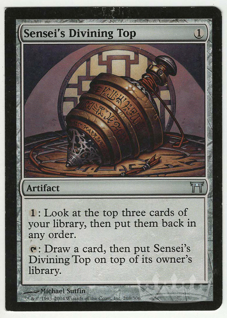 Detailed Notes: this cards has moderate to heavy surface/edge wear. This product is a listing for a rare factory miscut misprinted Sensei’s Divining Top, from Champions of Kamigawa. As shown in the scan, the lower left corner and upper left corners are square, while the other two corners are cut round as normal.