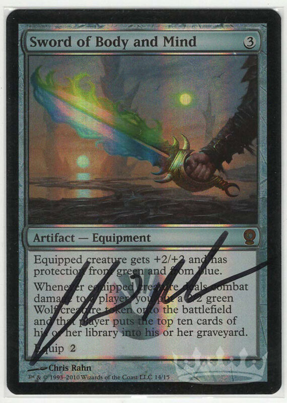 Detailed Notes: this cards has minimal surface/edge wear. This product is a listing for a rare crimped misprinted Sword of Body and Mind (Foil), from From the Vault: Relics, signed by artist Chris Rahn.